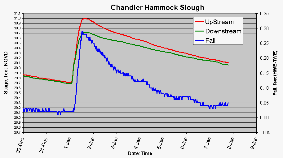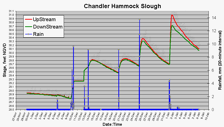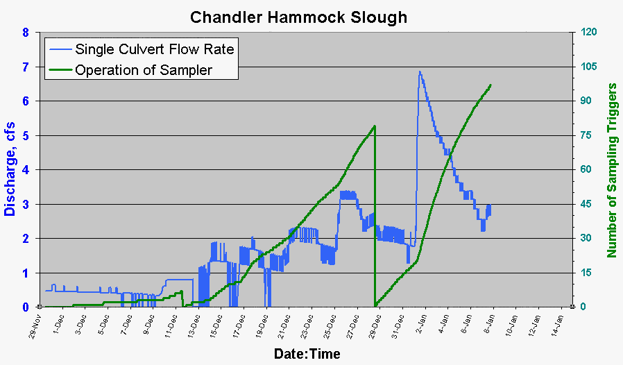 Data Collection The water quality monitoring system at Chandler Hammock Slough is a custom built flow measurement and sample collection system. The system collects a discrete flow-proportional composite sample both before and after the iron humate treatment structure. Click on the images to enlarge.